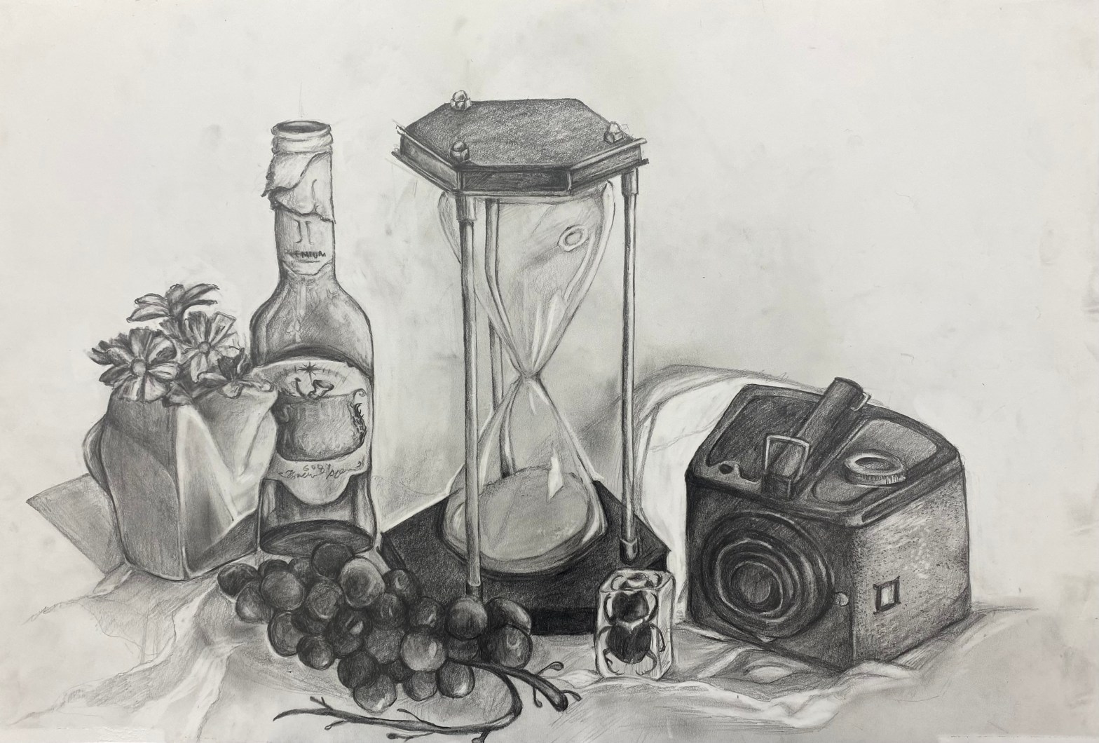 In this graphite drawing, I wanted to explore the theme of time and preservation. Each object – an hourglass, plastic grapes, a vintage bottle, faded flowers, an old camera, and a beetle encased in resin – tells a story of the past. They are all items that have lasted through time, each with its own history and beauty.